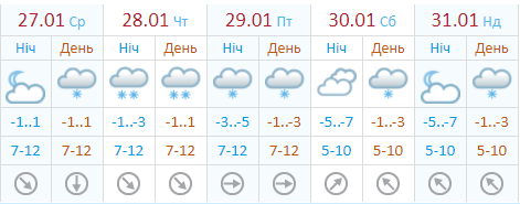27 января в Одесской, Николаевской, Кировоградской, Черкасской и Полтавской областях - значительные осадки в виде мокрого снега, налипание мокрого снега, на дорогах гололедица, в южной части Украины порывы ветра 15-20 м/с (и желтый уровень опасности).