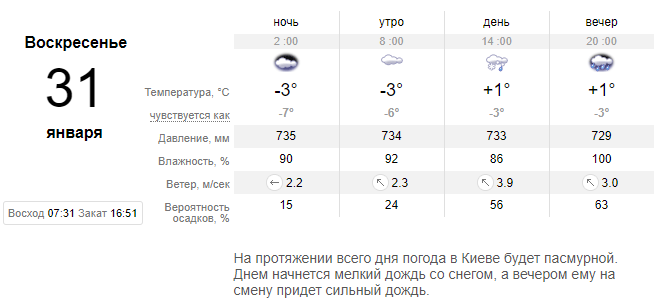 Как передает sinoptik.ua, 31 января в Киеве мелкий дождь со снегом начнется днем, а вечером ему на смену придет сильный дождь. Даже при небольшом морозе дороги могут стать непроездными.