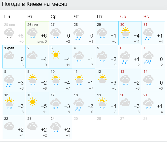 В Киеве 27 января будет облачно и прохладно. Днем ​​ожидается около нуля. Циклон затронет столицу снегом или 27 января поздно вечером, или уже ночью и утром 28 января.