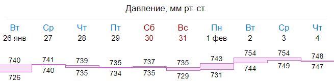 Что же касается атмосферного давления, то в Киеве 27 января оно будет в пределах нормы 740-742 мм. рт. А вот с 28 по 31 января включительно будет ниже нормы от 729 до 734 мм. рт.