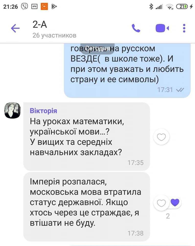 Одной нашей маме учитель пригрозила, что пойдет на ее работу (женщина работает в воинской части) и пожалуется на "ее недостойную риторику". Хотя мы никогда и нигде не выступали против украинского. Мы в патовой ситуации, теперь ребенок просит нас говорить с ним на украинском... иначе мы враги).