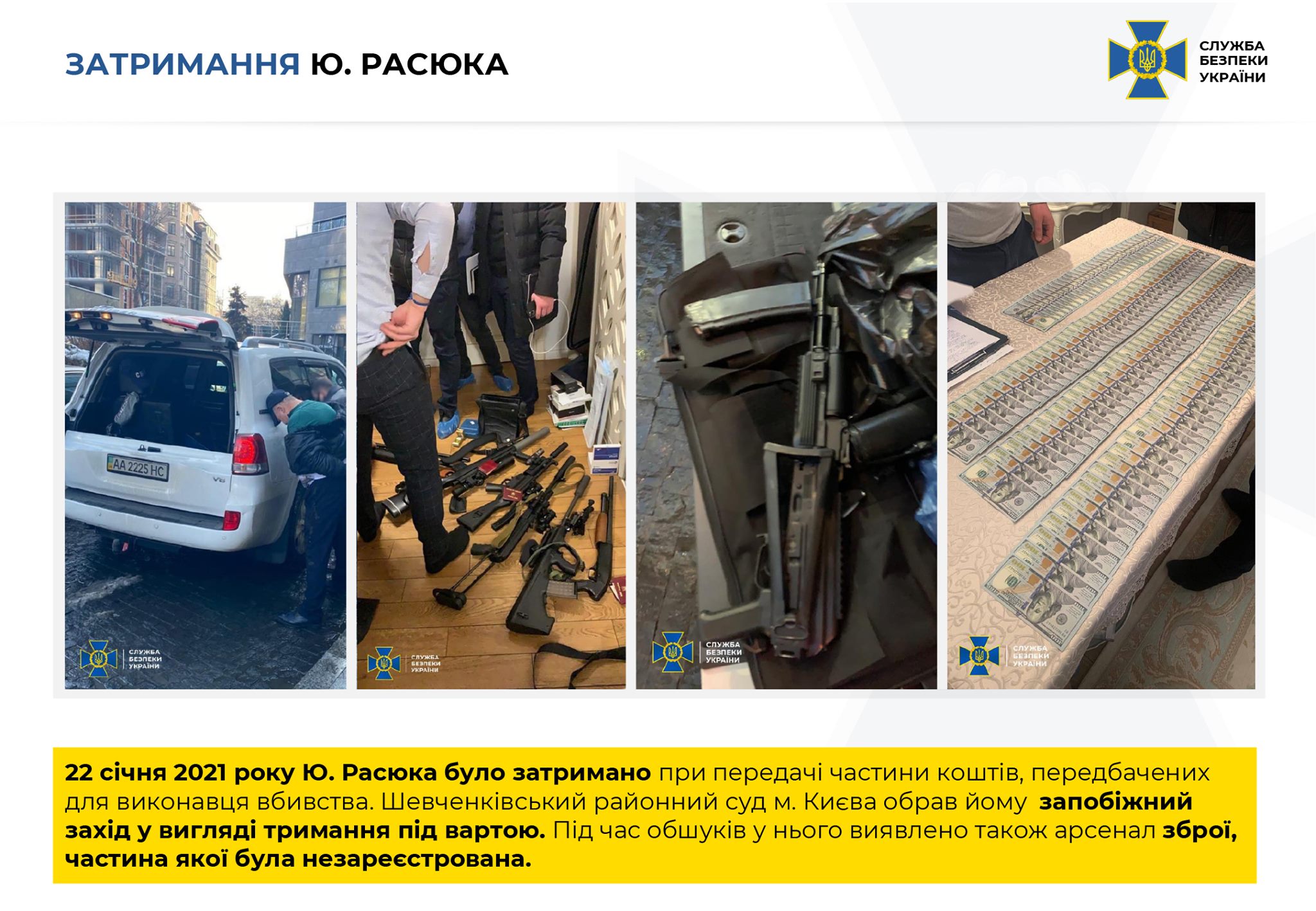 Во время очередной передачи денежных средств был задержан Ю. Расюк, которому 23 января 2021 Шевченковский районный суд Киева избрал меру пресечения в виде содержания под стражей", - рассказали в СБУ.