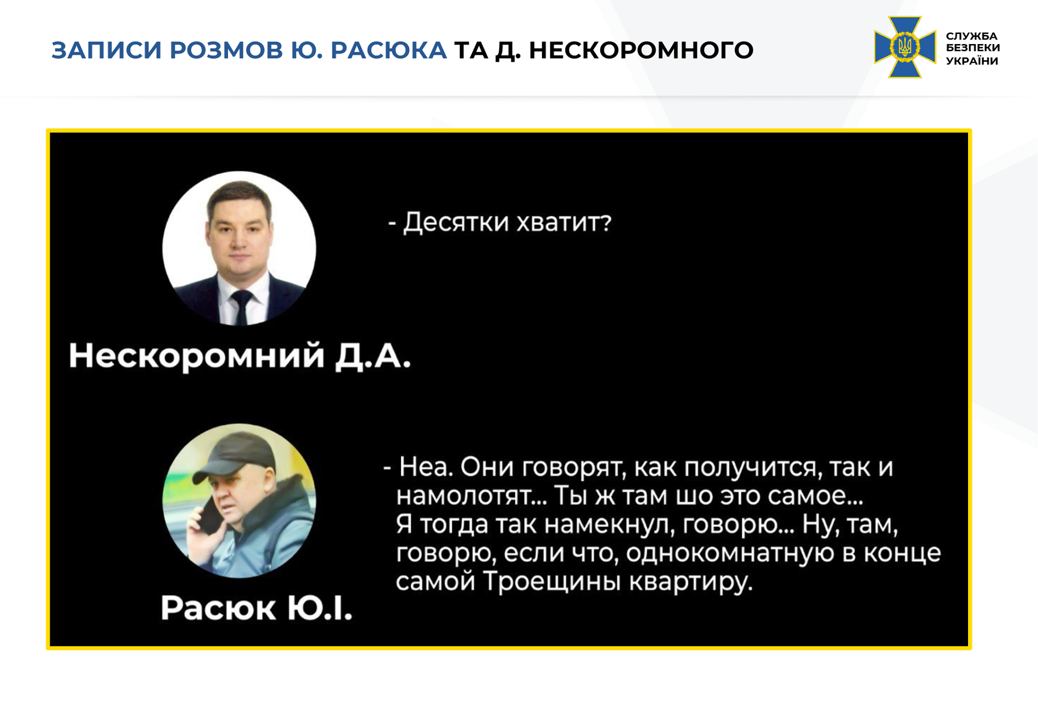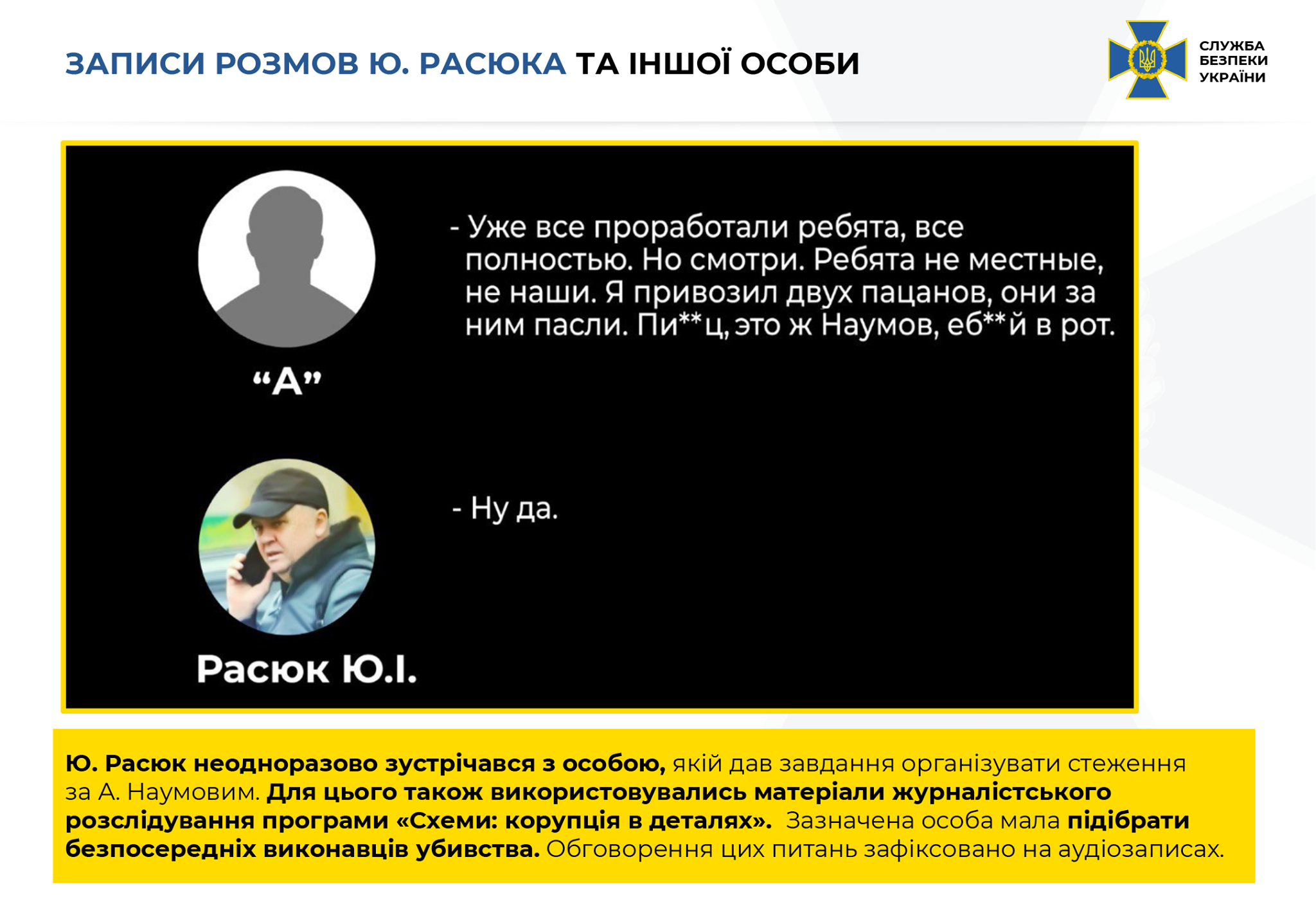 В свою очередь, среди доказательств, подтверждающих это: видео и фотоматериалы, аудиозаписи разговоров Ю. Расюка, Д. Нескоромного и других лиц. Во время записей, в частности, обсуждается организация убийства, его исполнители и другие детали.