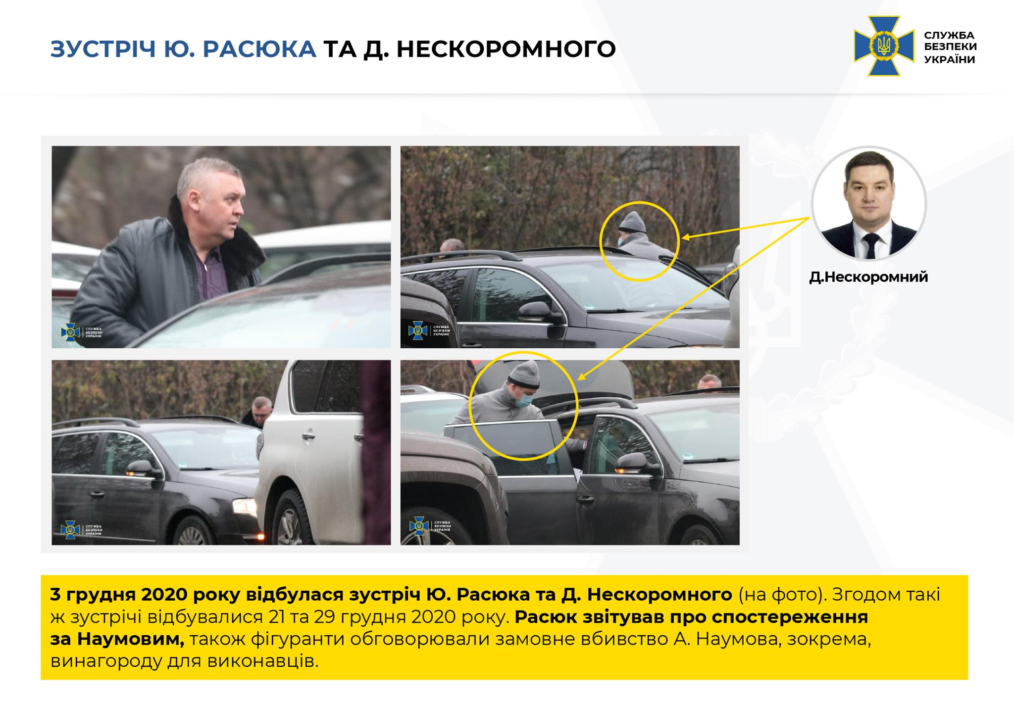 Главное следственное управление СБУ, которое осуществляет досудебное расследование под процессуальным руководством Офиса Генпрокурора, установило, что Дмитрий Нескоромный совместно с сотрудником Антитеррористического центра при СБУ Юрием Расюком решили лишить жизни начальника ГУВБ СБУ Андрея Наумова.