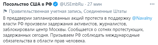 "В преддверии запланированных акций протеста в поддержку @Navalny власти РФ произвели задержания активистов, журналистов, заблокировали центр Москвы. Сообщается о сотнях протестующих, задержанных сегодня. Призываем РФ соблюдать международные обязательства в области прав человека".