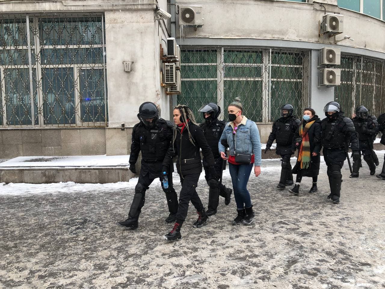 10:51 Люди подъезжают на метро, выходит по 5-10 человек. Пока протестующих человек 200 максимум. Отметим, что сегодня погода сложная для массовых акций: идёт снег, ветрено, все сразу тает, под ногами "каша".