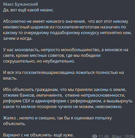 Нардеп от "Слуги народа" Максим Бужанский предположил, что цензоры из Гостелерадио ошиблись эпохой и вообразили себя комиссарами времен революции.
