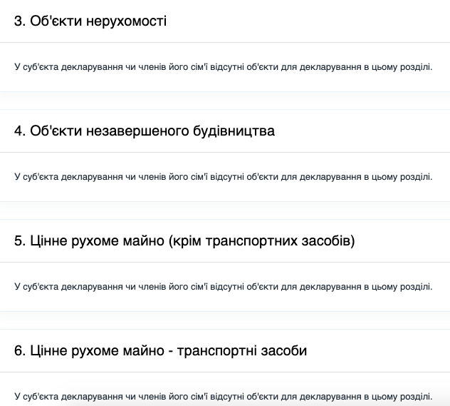 Несмотря на внушительный доход чиновника, сам он беден как церковная мышь. У Олийныка нет ни квартир, ни домов, ни строящегося жилья, ни машин, ни земли, ни вкладов в банках или наличности. Правда, и информации о тратах на аренду жилья или о праве проживания где-либо бесплатно, в его декларации также нет.