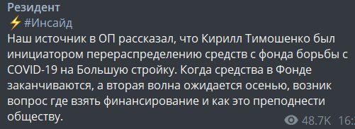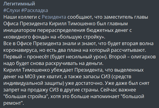 Первый же в списке линк ведет на сообщение о том, что замглавы ОП Кирилл Тимошенко придумал взять деньги из ковидного фонда и пустить на "Большую стройку".