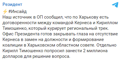 Зато здесь и далее бросается в глаза, что особенно "бьют про национальной безопасности" посты про Кирилла Тимошенко. Вот новый пост, где идет речь о договорняке между ОП и харьковскими элитами после выборов в Харькове.
