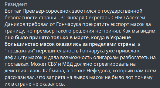 Еще одна запись "Резидента", вошедшая в "пидозру", - это общеизвестная информация о том, как правительство Гончарука, несмотря на требования СНБО, не стало закрывать экспорт масок из Украины