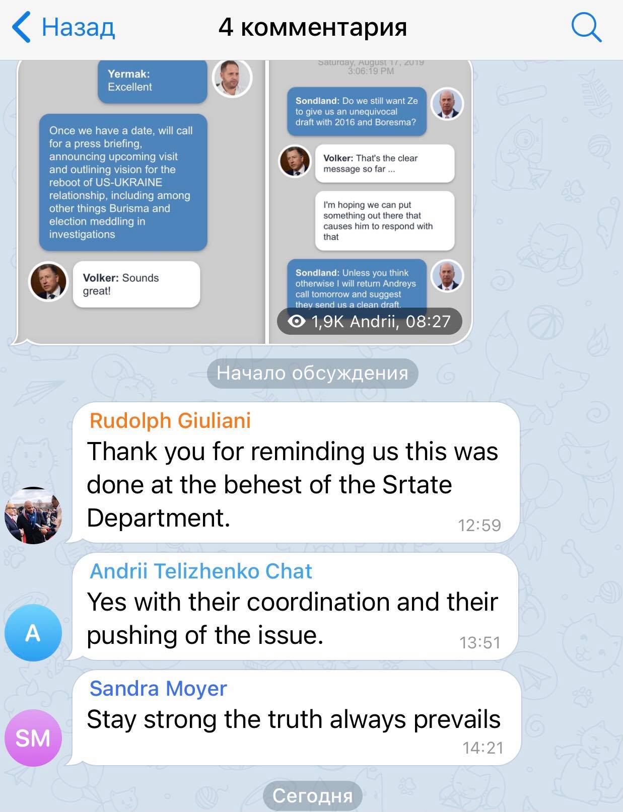 Телиженко, будучи близок к Джулиани, присутствовал во время разговоров юриста Трампа и Ермака. По его мнению, именно Ермак должен стать главным фигурантом американских санкций с учетом его попыток организовать встречу Зеленского с  Трампом в обмен на гарантии в расследовании дела "Бурисмы" и сына Байдена.