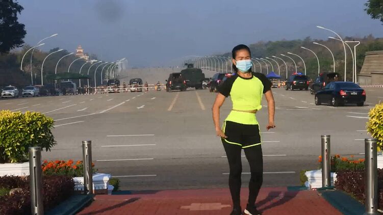 В Мьянме, где 1 февраля произошел военный переворот, фитнес-блогерша сняла видеоурок на фоне бронированных машин с пулеметами.