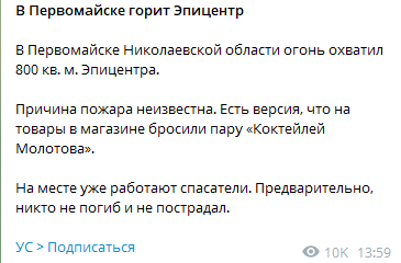 По данным СМИ, "Эпицентр" в Первомайске подожгли, подозреваемого задержали.