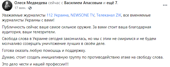 "Уважаемые журналисты 112 Украина, NEWSONE TV, Телеканал ZIK, все вменяемые журналисты Украины с вами!