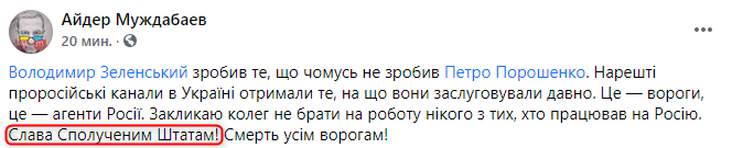 "Владимир Зеленский сделал то, что почему-то не сделал Петр Порошенко. Наконец, пророссийские каналы в Украине получили то, что они заслуживали давно. Это - враги, это - агенты России. Призываю коллег не брать на работу никого из тех, кто работал на Россию. Слава Соединенным Штатам! Смерть всем врагам!"