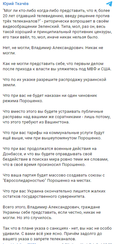 - Зеленский сказал, что он уже 20 лет на телевидении и ненавидит цензуру. Поэтому раз даже он согласился закрыть СМИ, то основания действительно есть.
