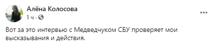 "Вот за это интервью с Медведчуком СБУ проверяет мои высказывания и действия", - написала Березовская.