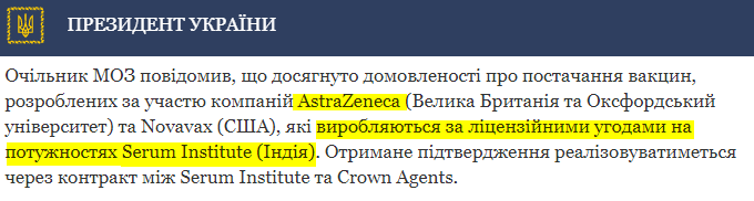 У Зеленского ее назвали AstraZeneka. Однако на сайте компании-производителя Serum Institute такой продукт не указан. Он не производится ни в самой Индии, ни на заводах компании за рубежом.