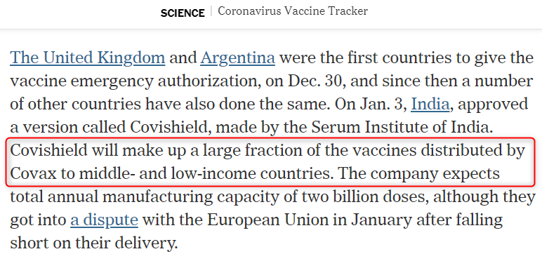 "Covishield будет составлять значительную часть вакцин, распространяемых Covax в странах со средним и низким уровнем доходов", - говорится на сайте газеты.