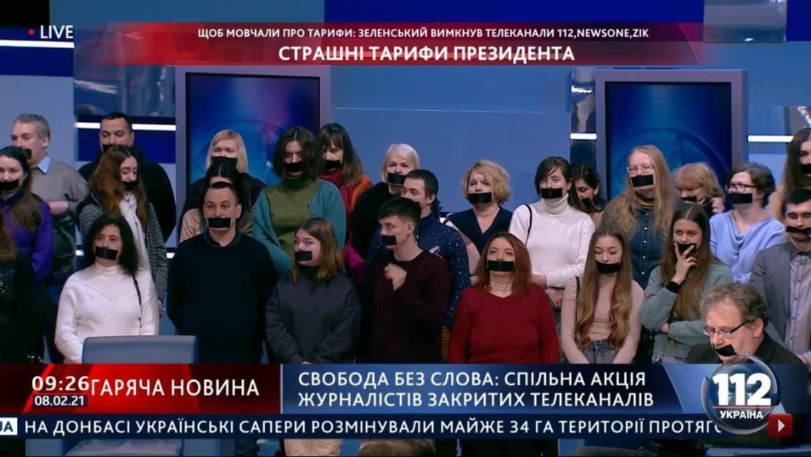 Утром в понедельник, 8 февраля, журналисты трех закрытых оппозиционных каналов ZIk, 112 и NewsOne вышли в эфир с заклеенными ртами в знак протеста против ограничения на свободу слова.