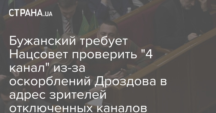 Народный депутат от "Слуги народа" Максим Бужанский требует Национальный совет по телевидению и радиовещанию проверить "4 канал" из-за оскорблений зрителей заблокированных телеканалов "112-Украина", NewsOne и ZIK, прозвучавших из уст ведущего Остапа Дроздова.
