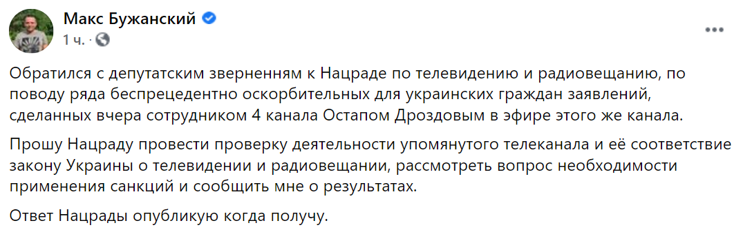 "Обратился с депутатским обращением к Нацсовету по телевидению и радиовещанию по поводу ряда беспрецедентно оскорбительных для украинских граждан заявлений, сделанных вчера сотрудником "4 канала" Остапом Дроздовым в эфире этого же канала", - написал Бужанский.
