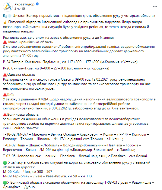 В частности, в Ивано-Франковской области с 11:00 пятницы, 12 февраля, ограничено движение для грузового транспорта на дорогах: Р-24 Татаров - Каменец-Подольский, км 117+800 – 177+890 (г. Коломыя - с.Устечко); Р-20 Снятин-Тязов, км 0+000 – 27+300 (г. Снятин – г. Городенка).
