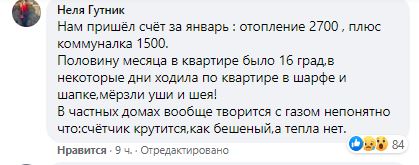 "Нам пришёл счёт за январь : отопление 2700 , плюс коммуналка 1500. Половину месяца в квартире было 16 град, в некоторые дни ходила по квартире в шарфе и шапке, мёрзли уши и шея! В частных домах вообще творится с газом непонятно что: счётчик крутится, как бешеный, а тепла нет".
