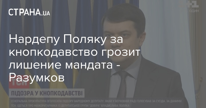 Спикер Верховной Рады Украины Дмитрий Разумков пояснил, что грозит мажоритарщику из группы "Доверие" Владиславу Поляку, которому выдвинули подозрение в кнопкодавстве. По словам председателя парламента, нардеп потеряет полномочия, если суд признает его виновным.