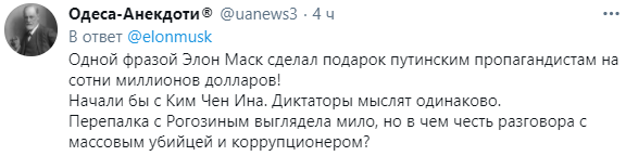 Вал негатива в адрес Маска от украинцев пошел сразу в комментариях к твиту. Его назвали "дол...бом", предложили поговорить с Саддамом Хусейном или Ким Чен Ыном. Также некоторые пользователи из Украины считают, что твит Маска - это "зашквар".