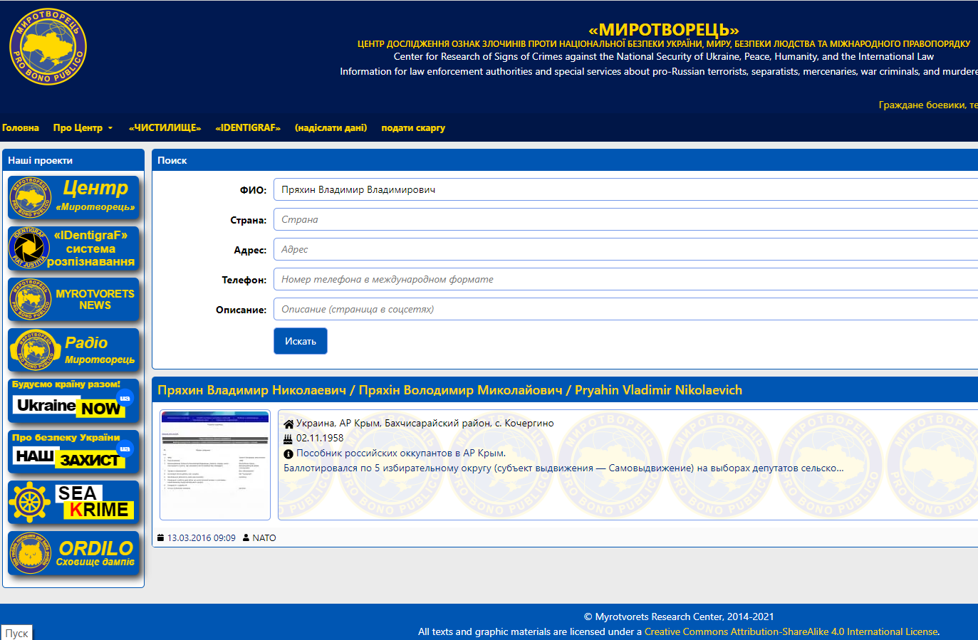 Первая - профайл этого человека на данный момент отсутствует на сайте "Миротворец". Там есть лишь его частичный тезка из Крыма.