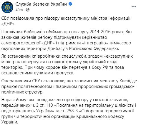 СБУ сегодня, 15 февраля, сообщила о подозрении экс-заместителю "министра информации ДНР". Он, как оказалось, жил и работал в Киеве.