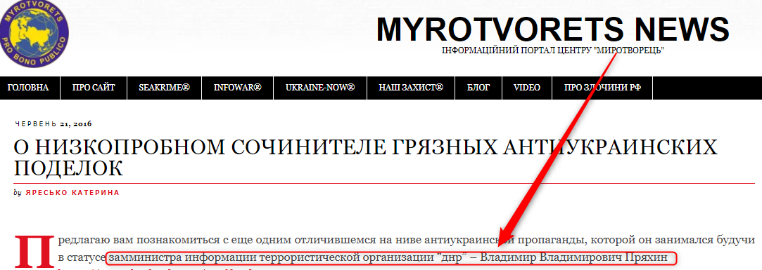 Как видно из скриншота ниже, еще в 2016 году "Миротворец" писал разоблачительный материал о Пряхине - тогда действующем "чиновнике". Но сейчас его на сайте, куда люди попадают и за меньшее, нету.