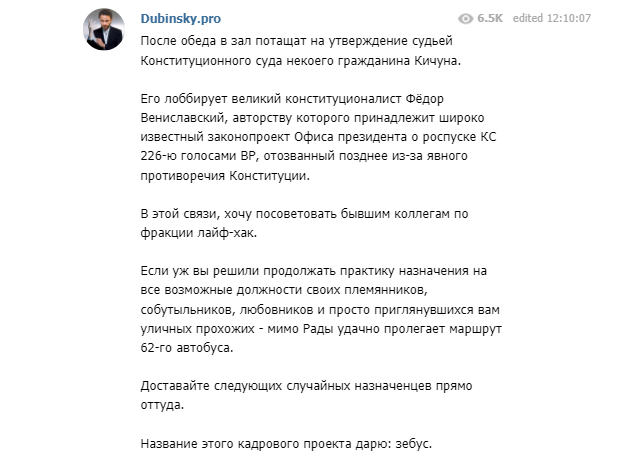 "Его лоббирует великий конституционалист Фёдор Вениславский, авторству которого принадлежит широко известный законопроект Офиса президента о роспуске КС 226-ю голосами ВР, отозванный позднее из-за явного противоречия Конституции", - написал Дубинский.