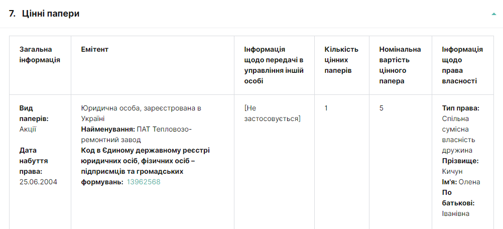 В декларации Кичуна указана сумма в 171 миллионов 717 431 гривен и 18 копеек, которую он получил как бенефициар публичного акционерного общества "Тепловозоремонтний завод". Частью акций этой компании владеет его супруга - Елена Кичун. Тендеры проводились в 2008, 2009, 2010, 2011 и 2018 годах.