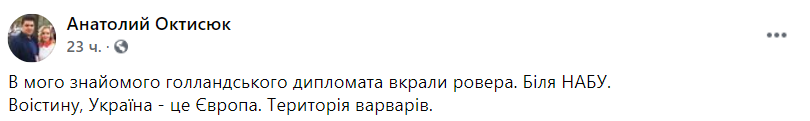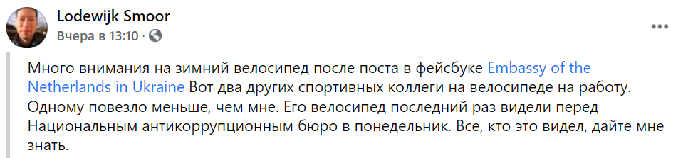 "У моего знакомого голландского дипломата украли велосипед. Возле НАБУ. Воистину, Украина - это Европа. Территория варваров", - написал он.
