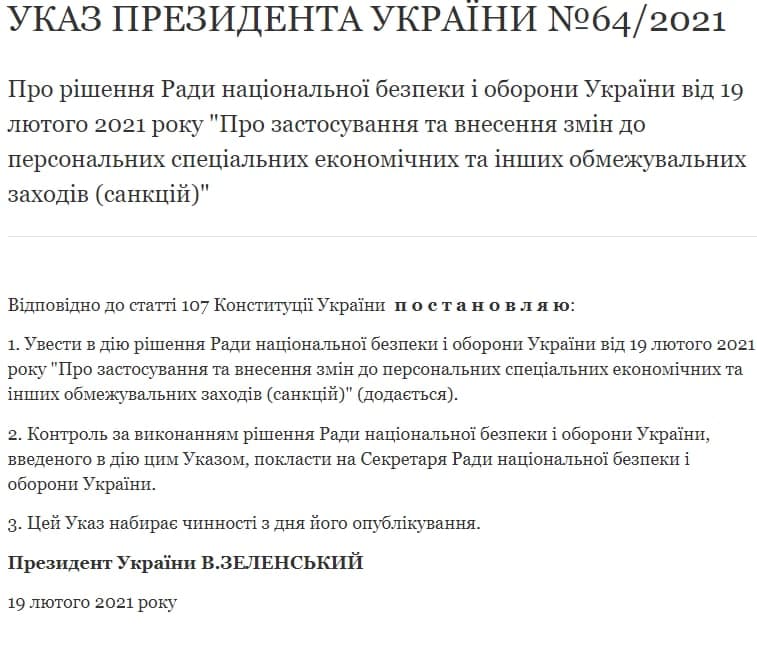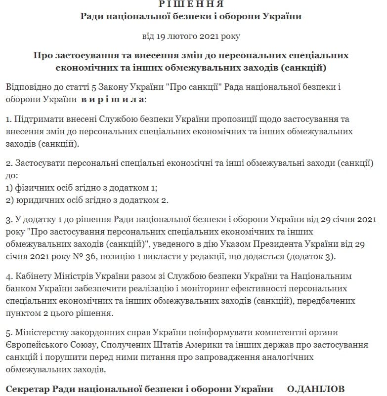 "Ввести в действие решение Совета национальной безопасности и обороны Украины от 19 февраля 2021г "О применении и внесении изменений в персональные специальные экономические и других ограничительные меры (санкции)" (прилагается)", - говорится в сообщении.