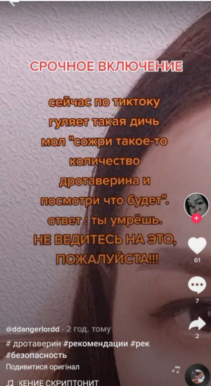 Так, одна девушка написала: "Сейчас по ТикТоку гуляет такая дичь: мол, сожри такое-то количество "Дротаверина" и посмотри, что будет". Ответ: ты умрешь. Не ведитесь на это, пожалуйста".