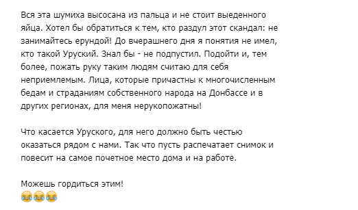 ...Вся эта шумиха высосана из пальца и не стоит выеденного яйца. Хотел бы обратиться к тем, кто раздул этот скандал: не занимайтесь ерундой! До вчерашнего дня я понятия не имел, кто такой Уруский. Знал бы - не подпустил. Подойти и, тем более, пожать руку таким людям считаю для себя неприемлемым. Лица, которые причастны к многочисленным бедам и страданиям собственного народа на Донбассе и в других регионах, для меня нерукопожатны.