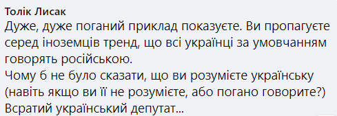 "Очень, очень плохой пример показываете. Вы пропагандируете среди иностранцев тренд, что все украинцы по умолчанию говорят на русском языке. Почему бы не сказать, что вы понимаете украинский (даже если её не понимаете, или плохо говорите? Всратый украинский депутат...)", - написал Толик Лысак.