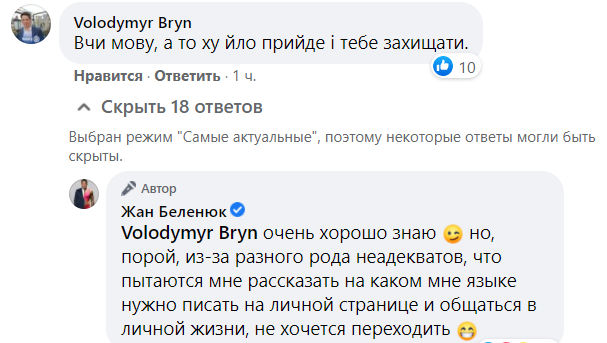 На пост нардепа обратили внимание националисты, которых возмутил ответ Беленюка о том, что он знает русский язык, а не украинский. В комментариях от защитников "мовы" посыпались оскорбления в адрес русскоговорящего украинского парламентария.