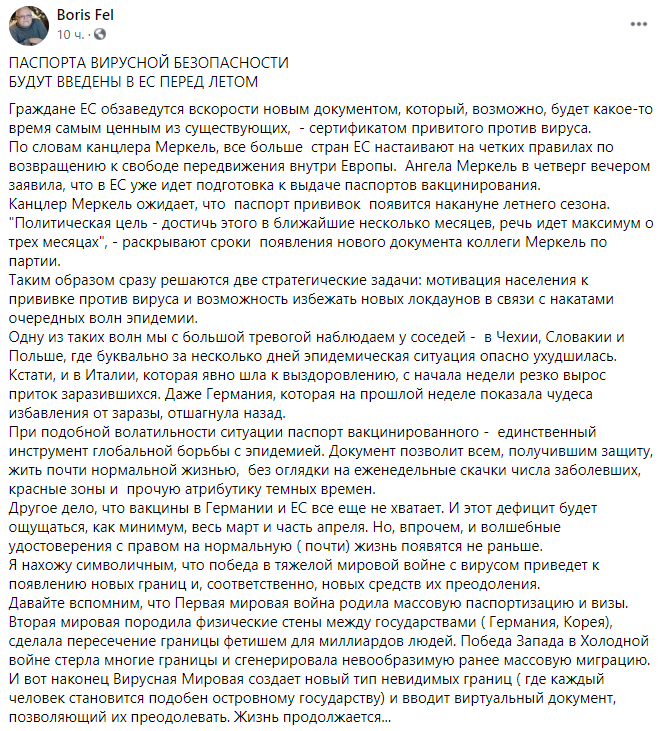 И вот наконец Вирусная Мировая создает новый тип невидимых границ (где каждый человек становится подобен островному государству) и вводит виртуальный документ, позволяющий их преодолевать", - пишет журналист из Берлина Борис Фельдман.