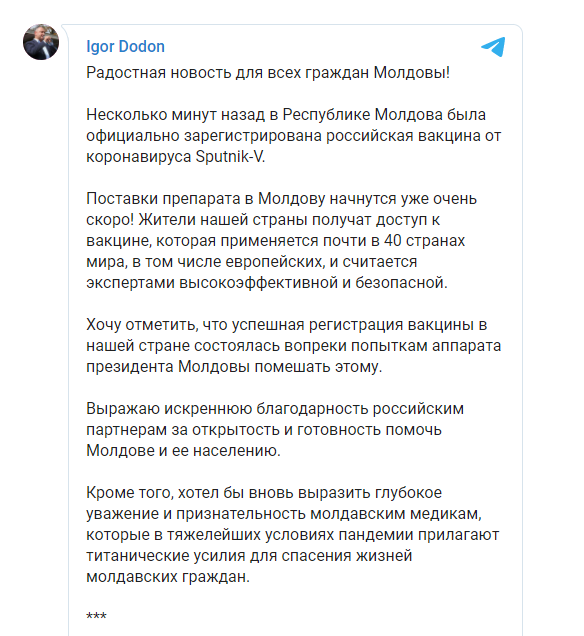 "Поставки препарата в Молдову начнутся уже очень скоро! Жители нашей страны получат доступ к вакцине, которая применяется почти в 40 странах мира, в том числе европейских, и считается экспертами высокоэффективной и безопасной", - сообщил Додон.