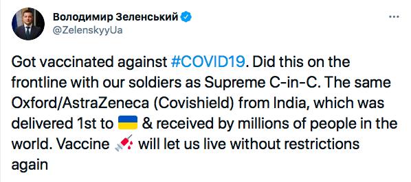 "Сделал прививку от Covid-19. Сделал это на передовой с нашими солдатами в качестве главнокомандующего. Тот же Oxford/AstraZeneca (Covishield) из Индии, который был доставлен первым в Украину, получили миллионы людей в мире. Вакцина позволит нам снова жить без ограничений", – написал Зеленский в твиттере на английском языке и прикрепил фото, опубликованное вверху этого материала.