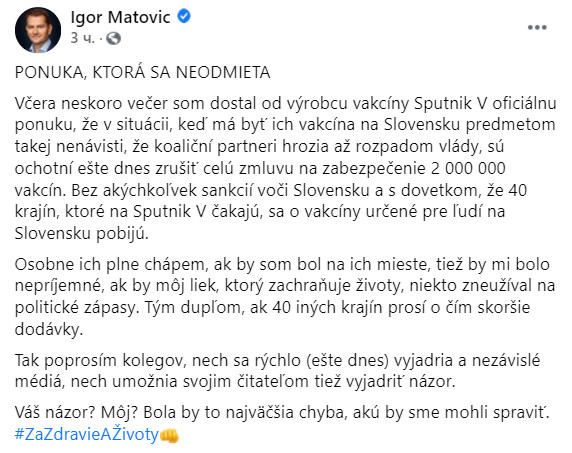 "Вчера поздно вечером я получил официальное предложение от производителя вакцины "Спутник V", что в ситуации, когда их вакцину в Словакии так ненавидят, что партнерам по коалиции угрожает распад правительства, они готовы отменить весь контракт на предоставление двух млн доз вакцин сегодня... без каких-либо санкций против Словакии", - заявил Матович.