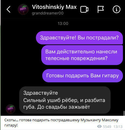 Кстати, помимо разбитой музыкальной аппаратуры у музыканта Максима Витошинского сильный ушиб ребер и разбита губа.