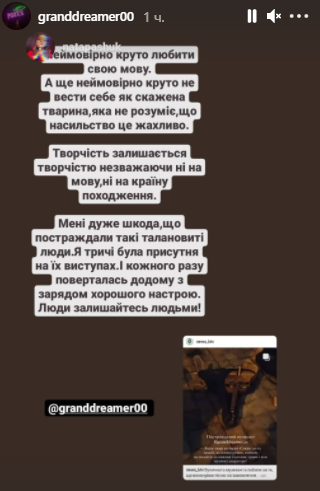 "Невероятно круто любить свой язык. А еще невероятно круто не вести себя как бешенное животное, которое не понимает, что насилие - это ужасно. Творчество остается творчеством, несмотря на язык и страну происхождения. Мне очень жаль, что пострадали такие талантливые люди. Я трижды присутствовала на их выступлениях. И каждый раз возвращалась домой с зарядом хорошего настроения. Люди, оставайтесь людьми!", - написала Nata Pashuk.