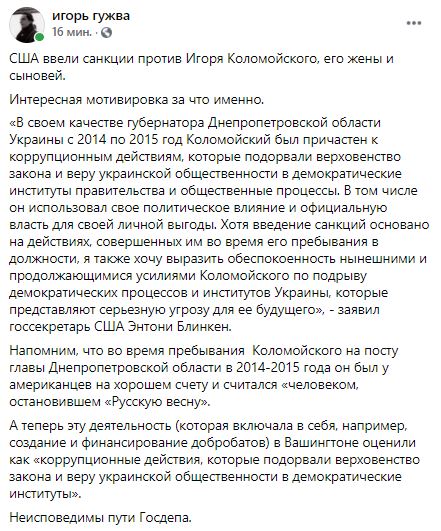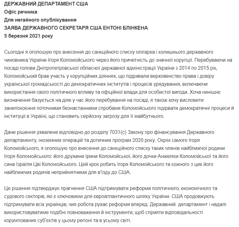 "Будучи главой Днепропетровской областной государственной администрации Украины с 2014 по 2015 год, Коломойский участвовал в коррупционных деяниях, которые подрывали верховенство права и доверие украинской общественности к демократическим институтам и процессам управления, включая использование своего политического влияния и официальной власти для личной выгоды", - говорится в заявлении.