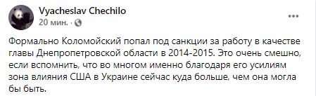 "Формально Коломойский попал под санкции за работу в качестве главы Днепропетровской области в 2014-2015. Это очень смешно, если вспомнить, что во многом именно благодаря его усилиям зона влияния США в Украине сейчас куда больше, чем она могла бы быть" - написал журналист Вячеслав Чечило.